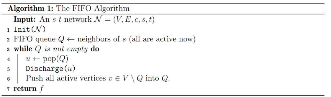 A FIFO (first-in first-out) queue is a data structure where elements are added (push) to the end of the queue and removed from the front (pop). Consider the following variant of the generic Preflow-Push algorithm: