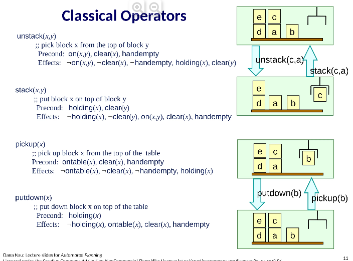 pickup(x) ;; gripper picks up block x from the top of the table Precond: ontable(x), clear(x), handempty Effects: not ontable(x), not clear(x), not handempty, holding(x)