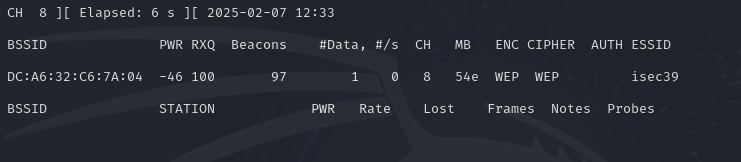 DC:A6:32:C6:7A:04 -45 90 1696 18 0 8 54e WEP WEP isec39