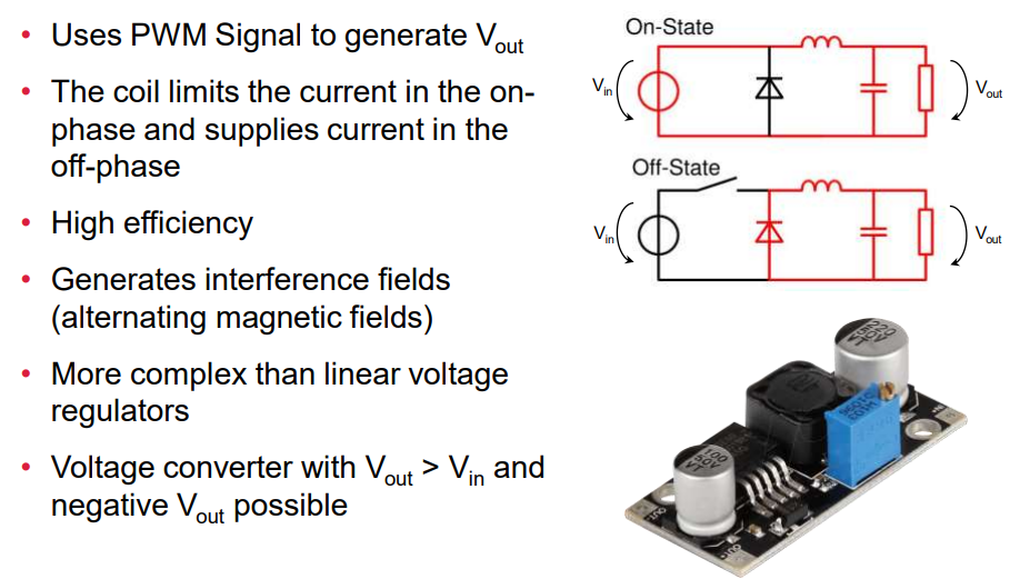 Based on voltage divider Operates with BJT or MOSFET Excess energy is converted into heat Not efficient when Vin>>Vout Drop-Out Voltage LDO Regulator (Vin–Vout<1V) Switched voltage regulator