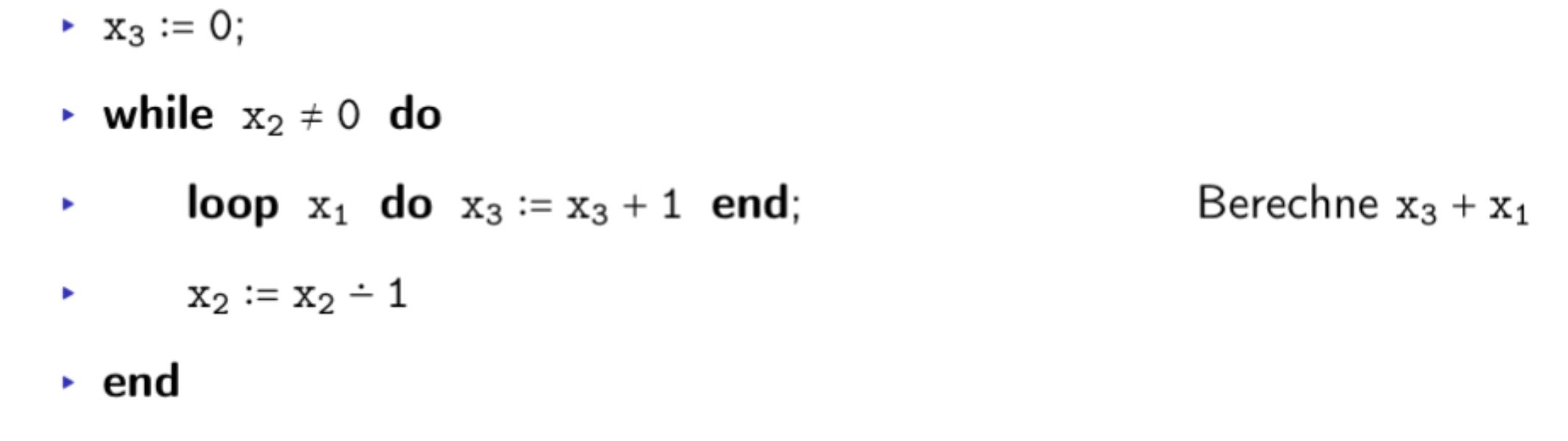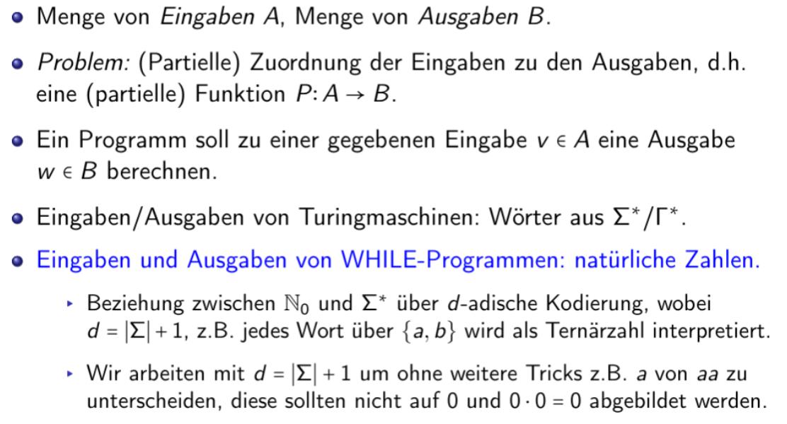 WHILE ist Turing-vollständig: ⇒ WHILE vs Turing Maschine Problem: d-adische Kodierung Syntax WHILE Syntax Semantik WHILE Semantik WHILE Semantik Formal Laufzeit und Platz-komplexitätsklasen WHILE Brechenbarkeit